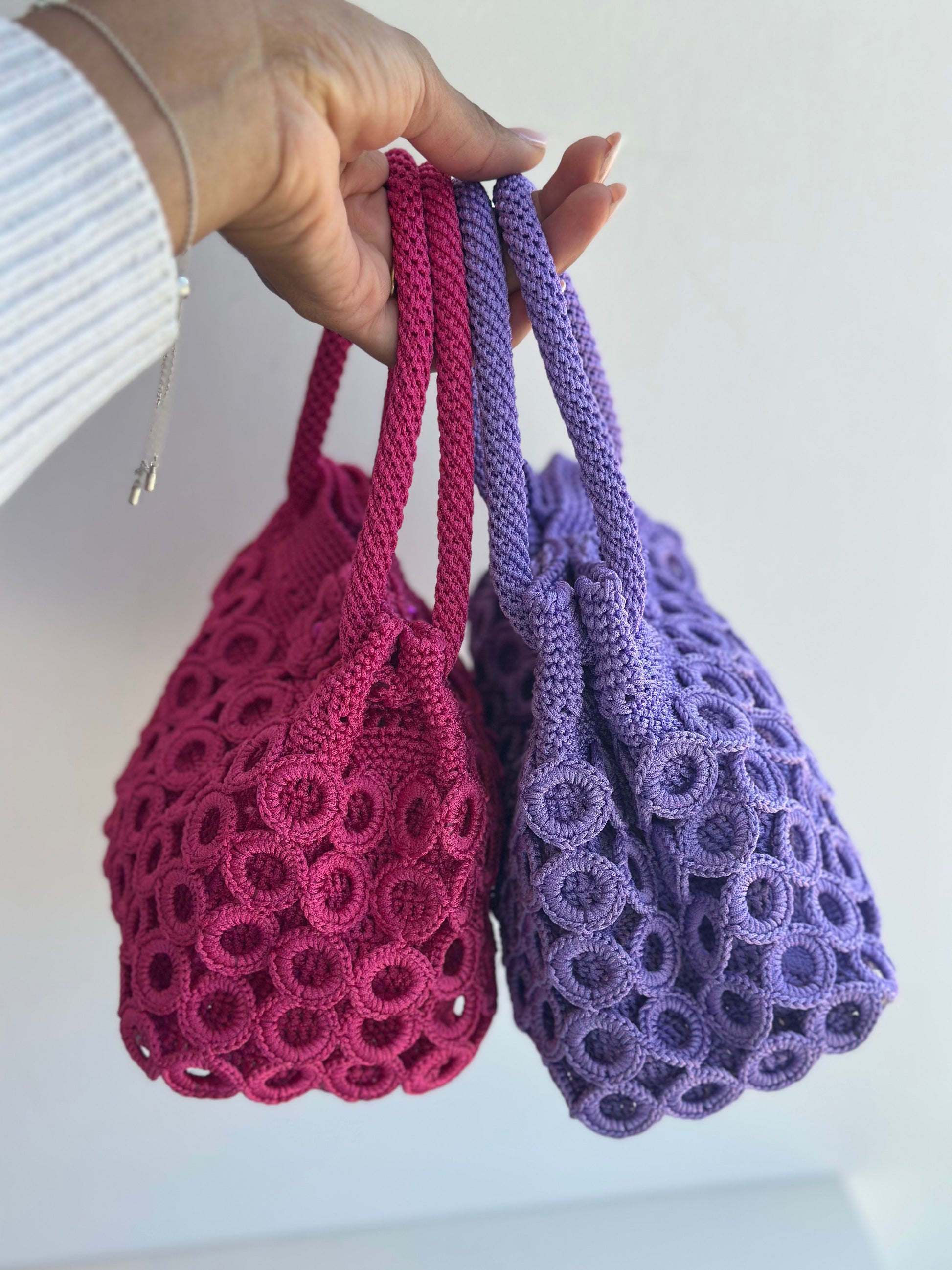 Disponibile in tonalità vibranti come il viola ametista e il fucsia intenso, ogni borsa è rifinita con un delicato fiore centrale tono su tono, arricchito da una perla luminosa. I doppi manici robusti, anch'essi lavorati a mano, offrono una presa confortevole senza rinunciare allo stile.